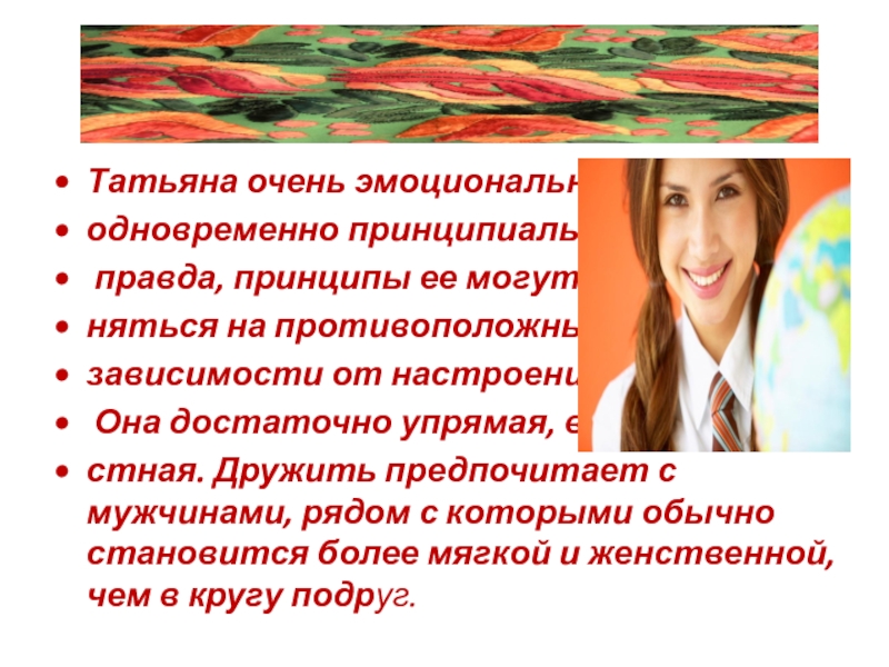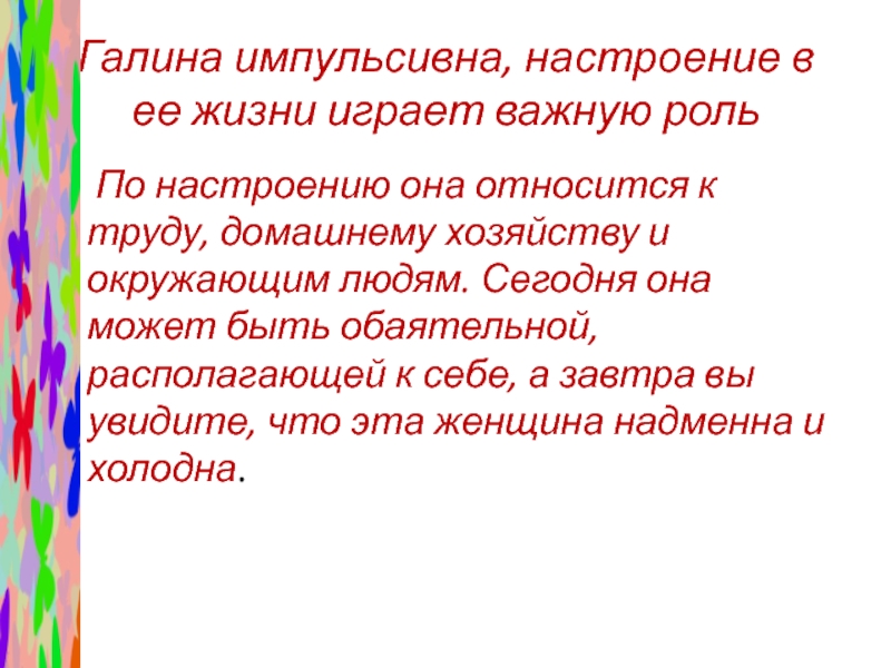 Слайд 19Галина импульсивна, настроение в ее жизни играет важную роль