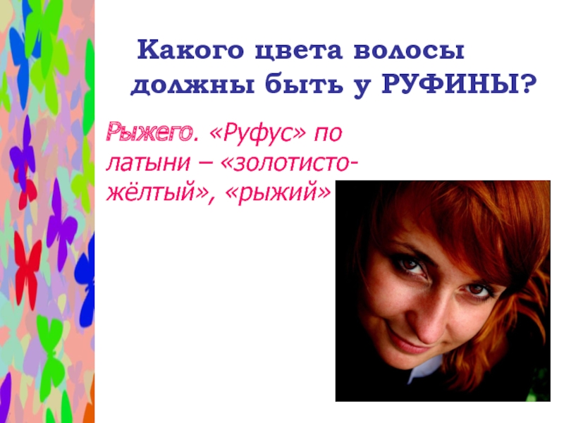 Слайд 46 Какого цвета волосы должны быть у РУФИНЫ?