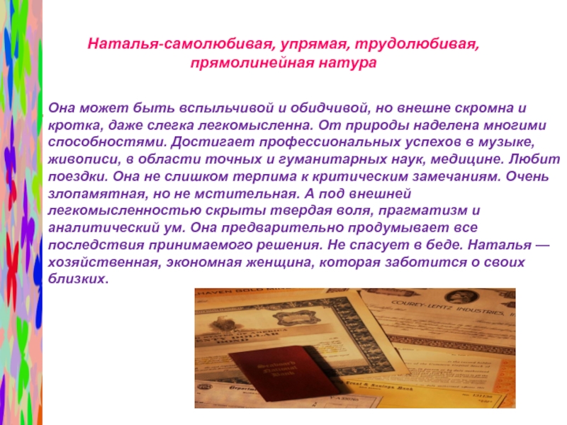 Слайд 43Наталья-самолюбивая, упрямая, трудолюбивая, прямолинейная натура