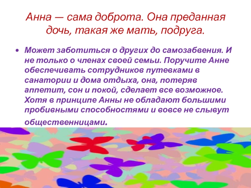Слайд 38Анна — сама доброта. Она преданная дочь, такая же мать, подруга.