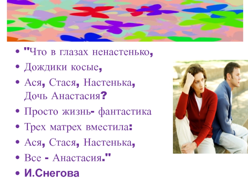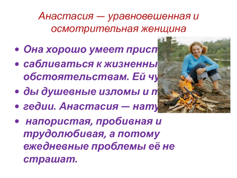 Слайд 35Анастасия — уравновешенная и осмотрительная женщина