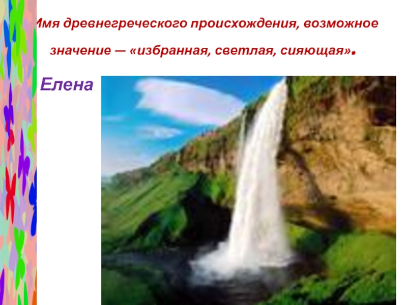 Слайд 47 Имя древнегреческого происхождения, возможное значение — «избранная, светлая, сияющая».