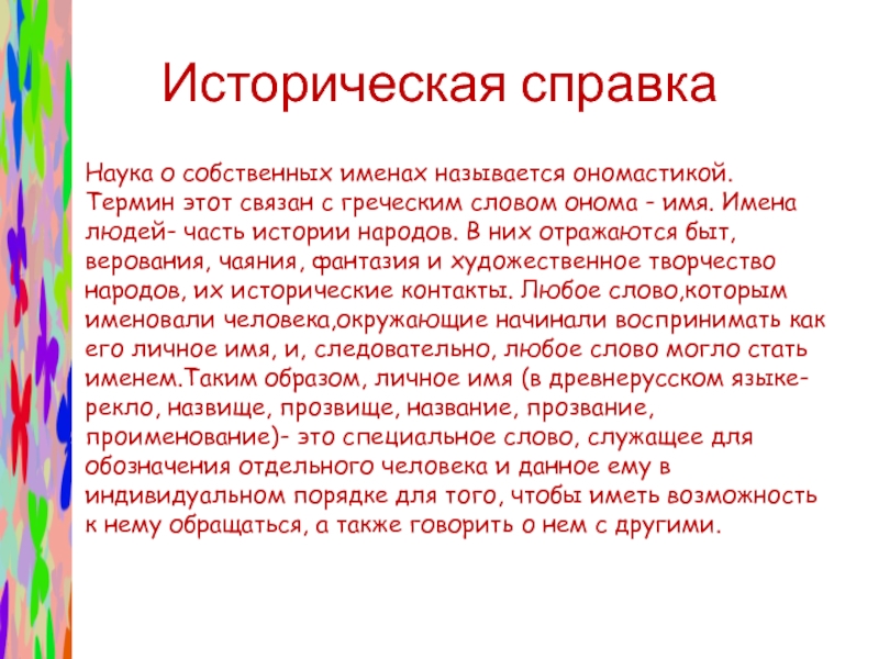 греческим словом онома - имя. Имена людей- часть истории народов. В них отражаются быт, верования, чаяния, фантазия и художественное творчество народов, их исторические контакты. Любое слово,которым именовали человека,окружающие начинали воспринимать как его личное имя, и, следовательно, любое слово могло стать именем.Таким образом, личное имя (в древнерусском языке- рекло, назвище, прозвище, название, прозвание, проименование)- это специальное слово, служащее для обозначения отдельного человека и данное ему в индивидуальном порядке для того, чтобы иметь возможность к нему обращаться, а также говорить о нем с другими.