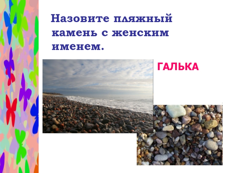 Слайд 17 Назовите пляжный камень с женским именем.