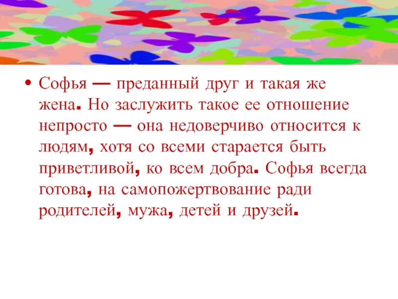 ее отношение непросто — она недоверчиво относится к людям, хотя со всеми старается быть приветливой, ко всем добра. Софья всегда готова, на самопожертвование ради родителей, мужа, детей и друзей.