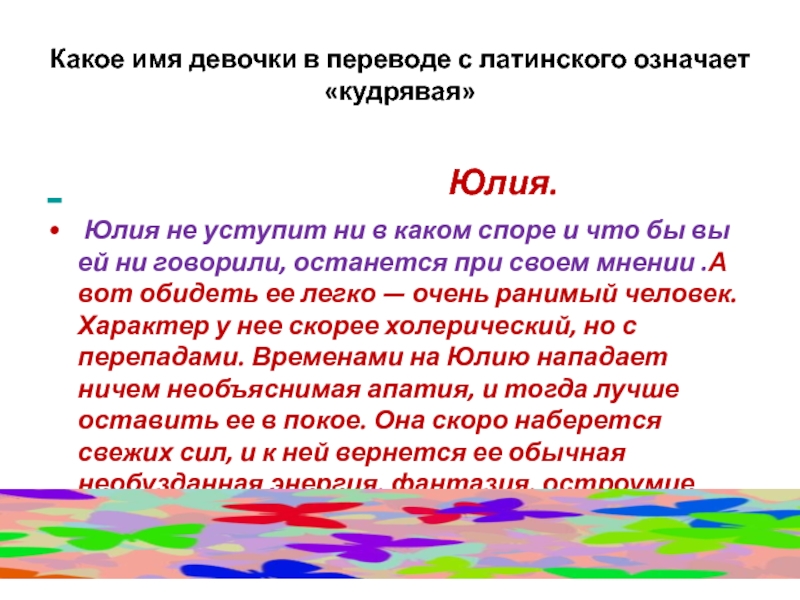 Слайд 50Какое имя девочки в переводе с латинского означает «кудрявая»