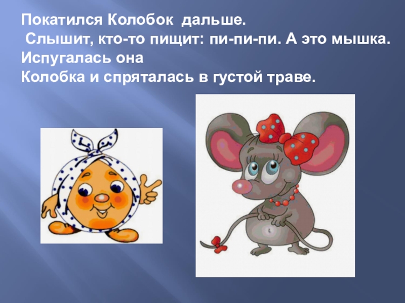 Покатился Колобок дальше. Слышит, кто-то пищит: пи-пи-пи. А это мышка. Испугалась она Колобка и спряталась в густой