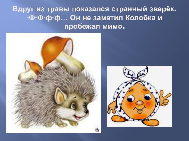Слайд 14Вдруг из травы показался странный зверёк. -Ф-Ф-ф-ф… Он не заметил Колобка и