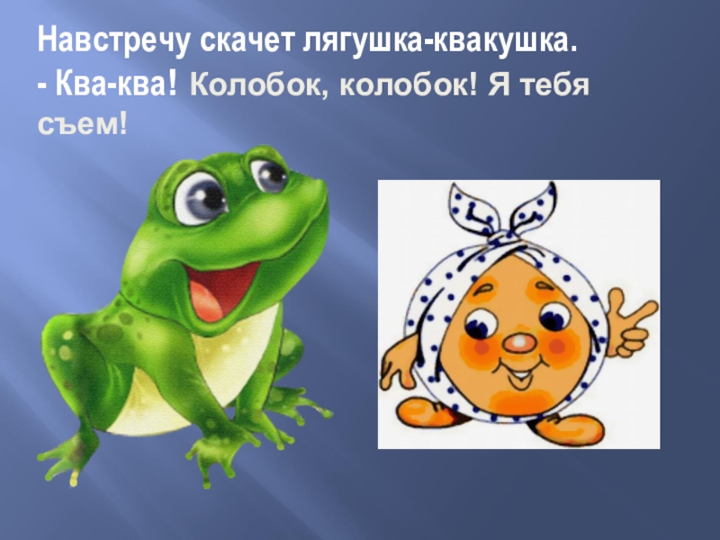 Навстречу скачет лягушка-квакушка. - Ква-ква! Колобок, колобок! Я тебя съем!