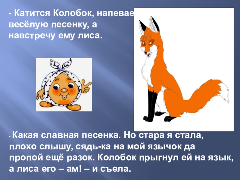 - Катится Колобок, напевает весёлую песенку, а навстречу ему лиса. - Какая славная песенка. Но стара я