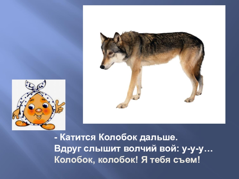 - Катится Колобок дальше. Вдруг слышит волчий вой: у-у-у… Колобок, колобок! Я тебя съем!