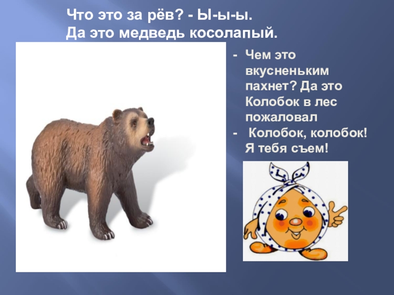 Что это за рёв? - Ы-ы-ы. Да это медведь косолапый. Чем это вкусненьким пахнет? Да это Колобок