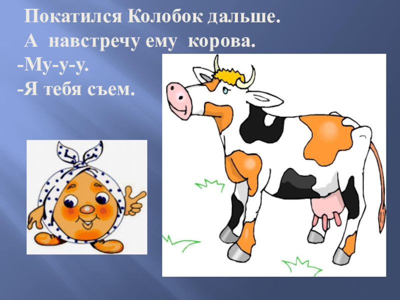Покатился Колобок дальше. А навстречу ему корова. Му-у-у.Я тебя съем.