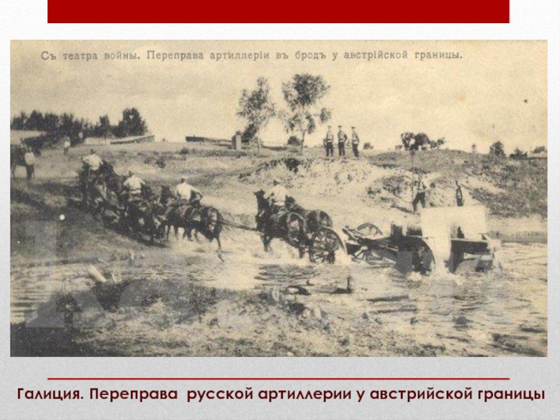Слайд 9Галиция. Переправа русской артиллерии у австрийской границы