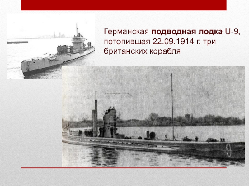 Слайд 16Германская подводная лодка U-9, потопившая 22.09.1914 г. три британских корабля