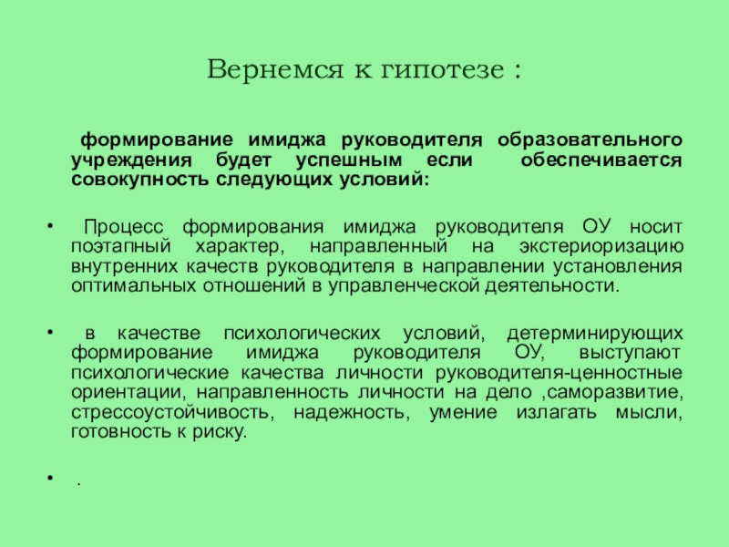 в качестве психологических условий, детерминирующих формирование имиджа руководителя ОУ, выступают психологические качества личности руководителя-ценностные ориентации, направленность личности на дело ,саморазвитие, стрессоустойчивость, надежность, умение излагать мысли, готовность к риску.