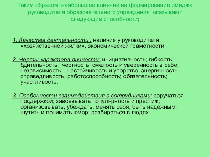 Слайд 14Таким образом, наибольшее влияние на формирование имиджа руководителя образовательного учреждения оказывают