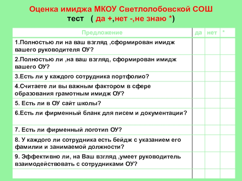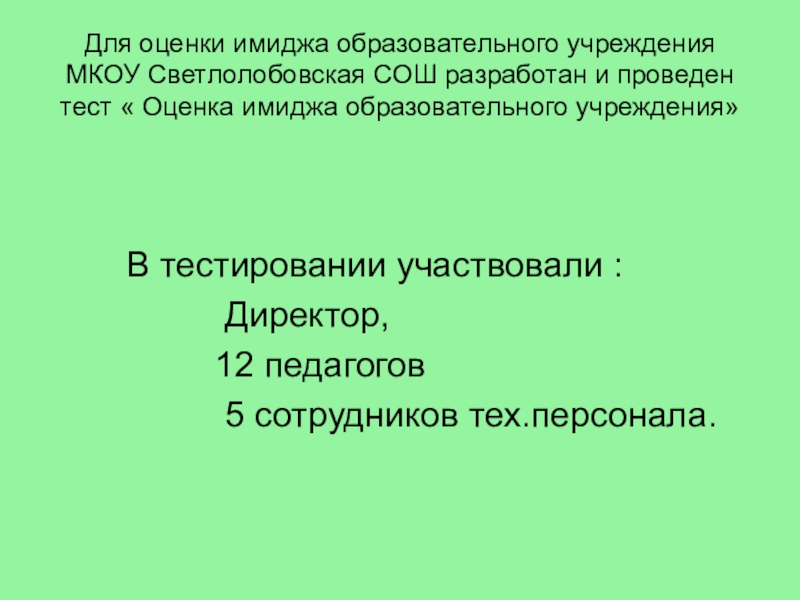 Слайд 15Для оценки имиджа образовательного учреждения МКОУ Светлолобовская СОШ разработан и проведен