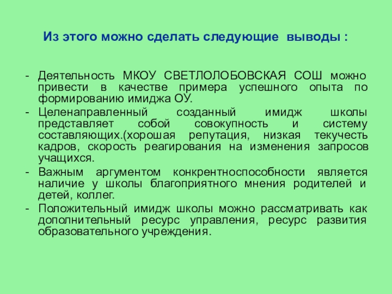 Положительный имидж школы можно рассматривать как дополнительный ресурс управления, ресурс развития образовательного учреждения.