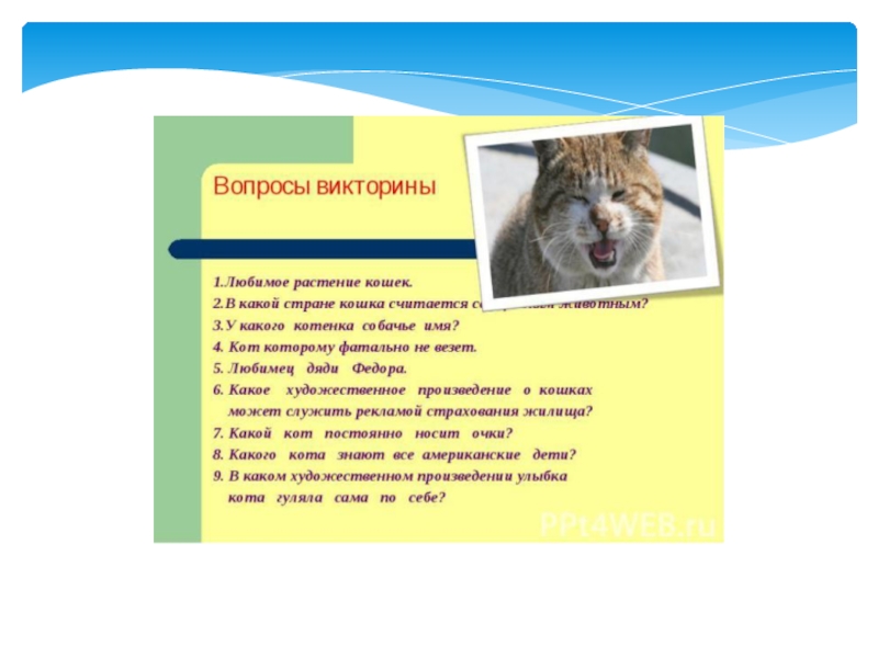 Конкурс «Угадай-ка»Вопрос 1Согласно народным приметам, что должно произойти, если кошка умывается?Вопрос 2Какой кот постоянно носил чёрные очки?Вопрос