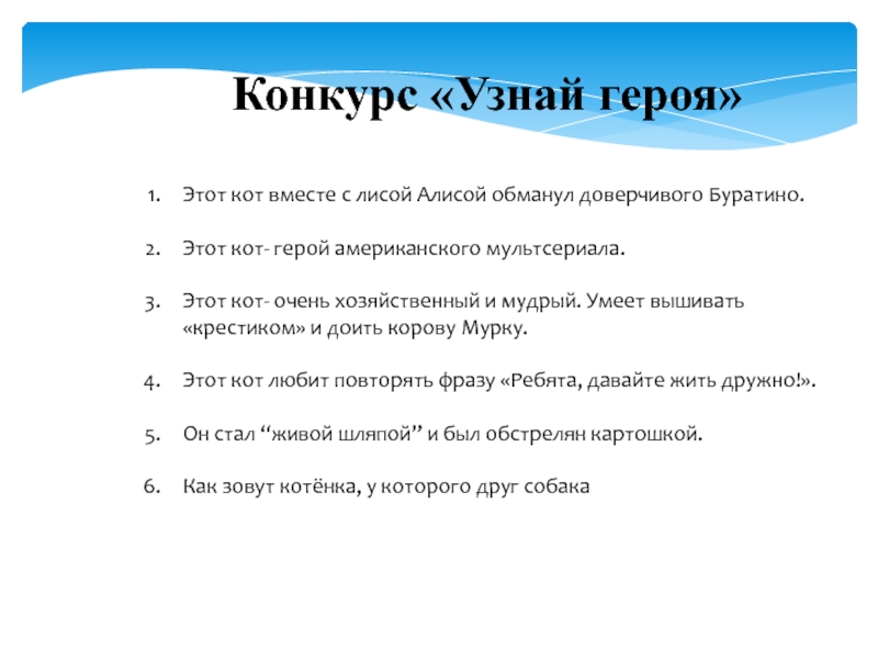 Конкурс «Узнай героя»Этот кот вместе с лисой Алисой обманул доверчивого Буратино.Этот кот- герой американского мультсериала.Этот кот- очень