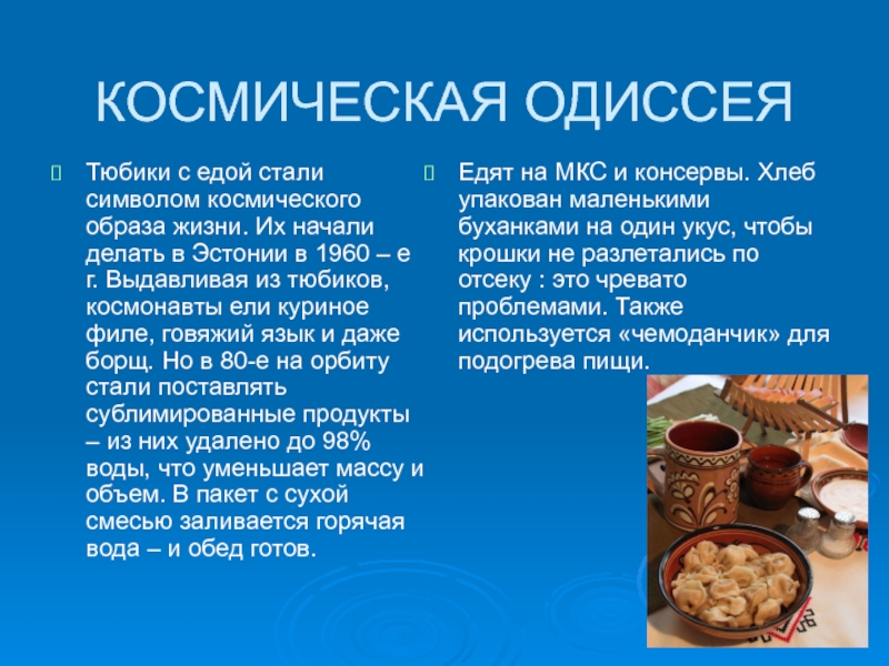 Едят на МКС и консервы. Хлеб упакован маленькими буханками на один укус, чтобы крошки не разлетались по отсеку : это чревато проблемами. Также используется «чемоданчик» для подогрева пищи.