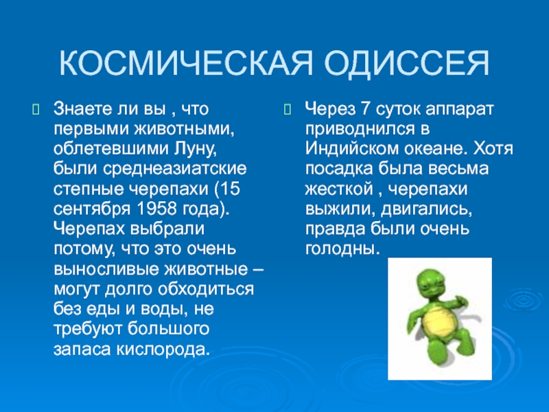 Через 7 суток аппарат приводнился в Индийском океане. Хотя посадка была весьма жесткой , черепахи выжили, двигались, правда были очень голодны.