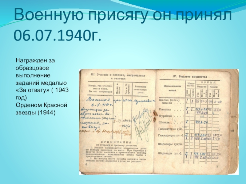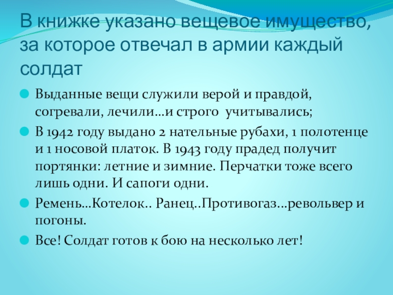 В 1942 году выдано 2 нательные рубахи, 1 полотенце и 1 носовой платок. В 1943 году прадед получит портянки: летние и зимние. Перчатки тоже всего лишь одни. И сапоги одни.