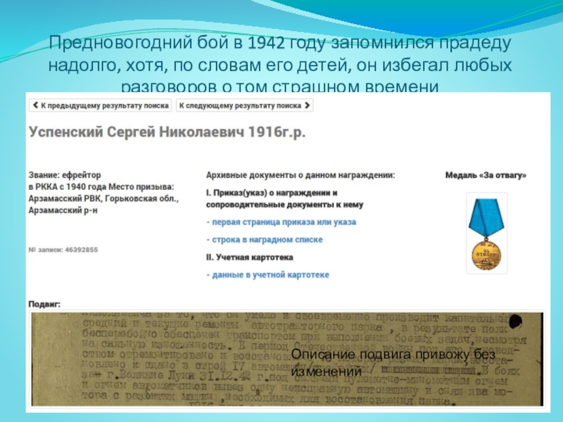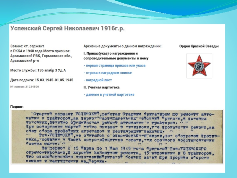 «В период Отечественной войны под его руководством полк бесперебойно обеспечен транспортом при выполнении боевых задач, несмотря на сильную изношенность. Под его руководством отремонтировано и восстановлено 75 моторов разных марок, восстановлено и сдано в строй 17 автомашин(трофейных). В боях за г.Великие Луки 31.12.1492 г. под сильным пулеметно-минометным огнем и огнем автоматчиков вывез одну неисправную автомашину и снял два мотора с разбитых машин, необходимых для восстановления парка»