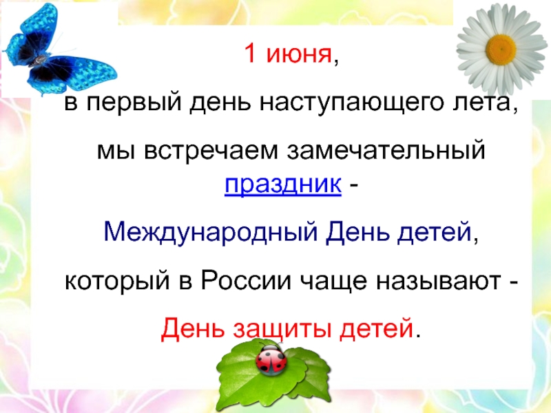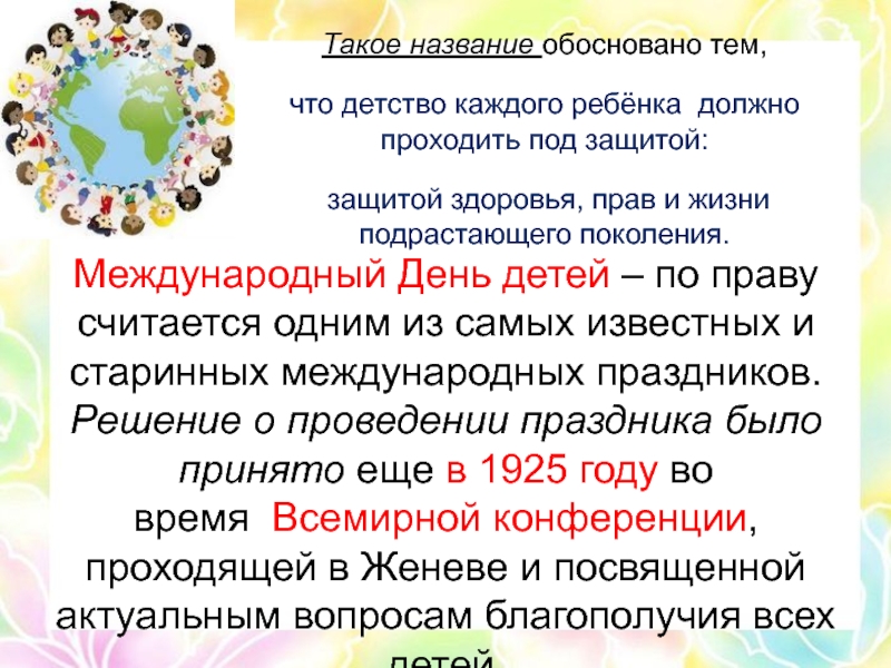 Международный День детей – по праву считается одним из самых известных и старинных международных праздников. Решение о проведении праздника было принято еще в 1925 году во время Всемирной конференции, проходящей в Женеве и посвященной актуальным вопросам благополучия всех детей.