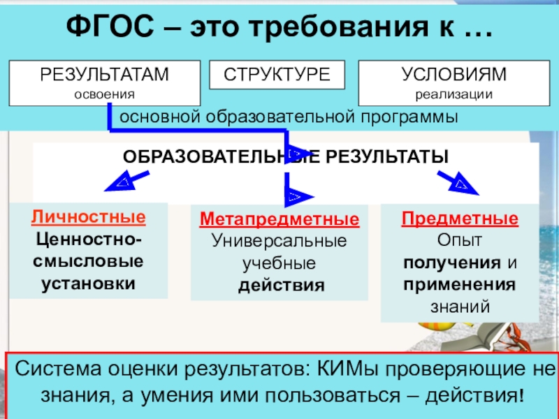 Система оценки результатов: КИМы проверяющие не знания, а умения ими пользоваться – действия!