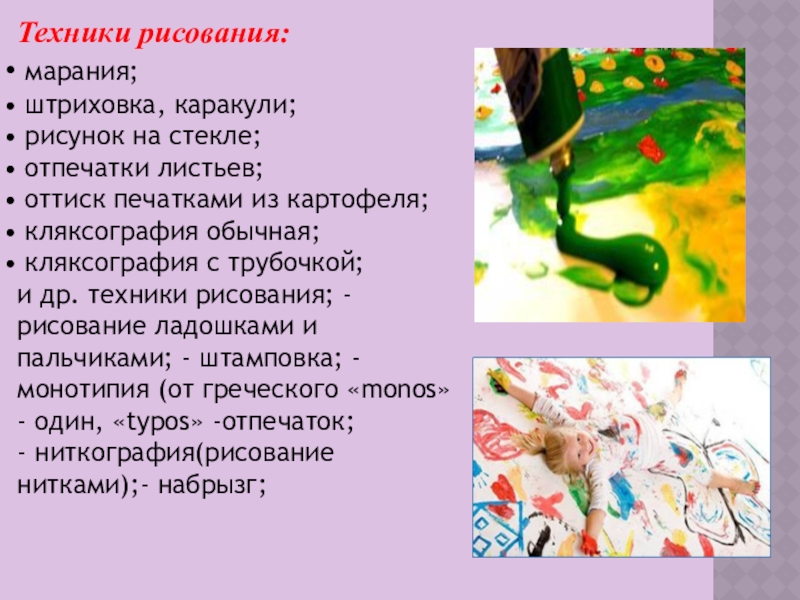 и др. техники рисования; - рисование ладошками и пальчиками; - штамповка; - монотипия (от греческого «monos» - один, «typos» -отпечаток;