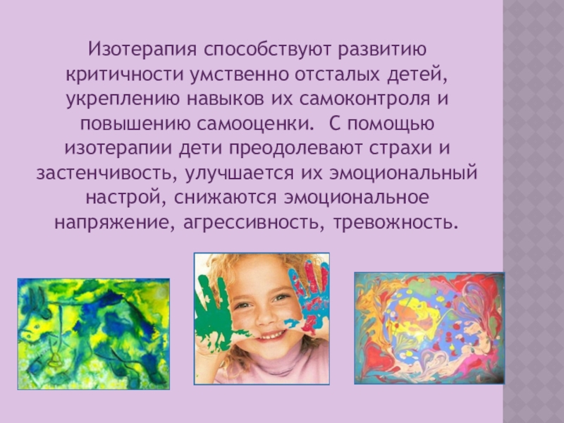 Слайд 16Изотерапия способствуют развитию критичности умственно отсталых детей, укреплению навыков их самоконтроля