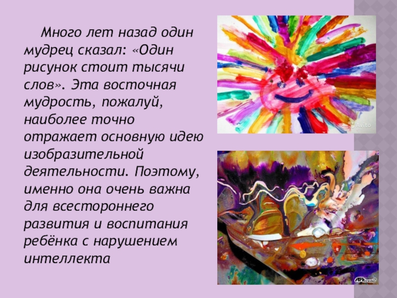 тысячи слов». Эта восточная мудрость, пожалуй, наиболее точно отражает основную идею изобразительной деятельности. Поэтому, именно она очень важна для всестороннего развития и воспитания ребёнка с нарушением интеллекта