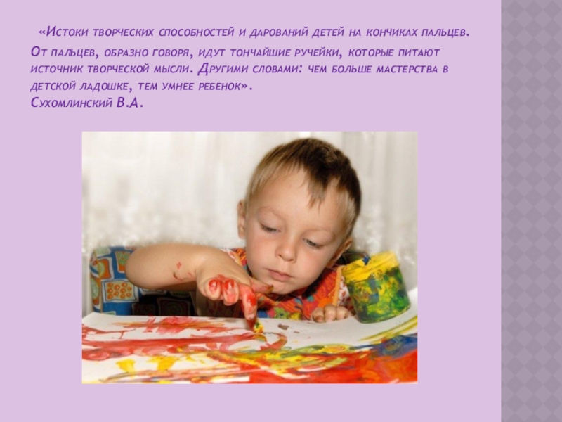 Слайд 2 «Истоки творческих способностей и дарований детей на кончиках пальцев. От