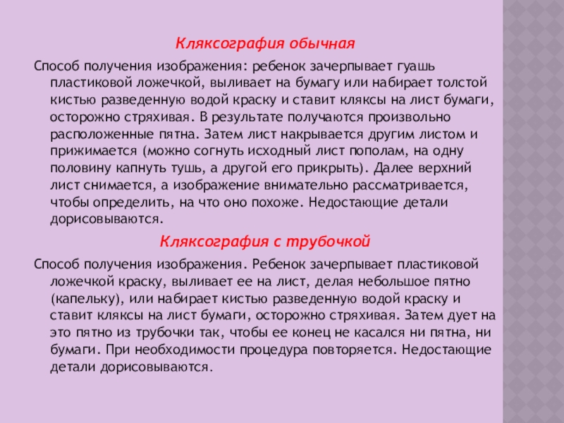на бумагу или набирает толстой кистью разведенную водой краску и ставит кляксы на лист бумаги, осторожно стряхивая. В результате получаются произвольно расположенные пятна. Затем лист накрывается другим листом и прижимается (можно согнуть исходный лист пополам, на одну половину капнуть тушь, а другой его прикрыть). Далее верхний лист снимается, а изображение внимательно рассматривается, чтобы определить, на что оно похоже. Недостающие детали дорисовываются.