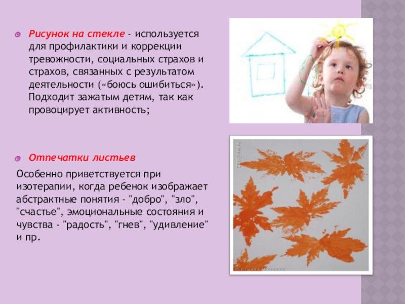 Слайд 10Рисунок на стекле - используется для профилактики и коррекции тревожности, социальных