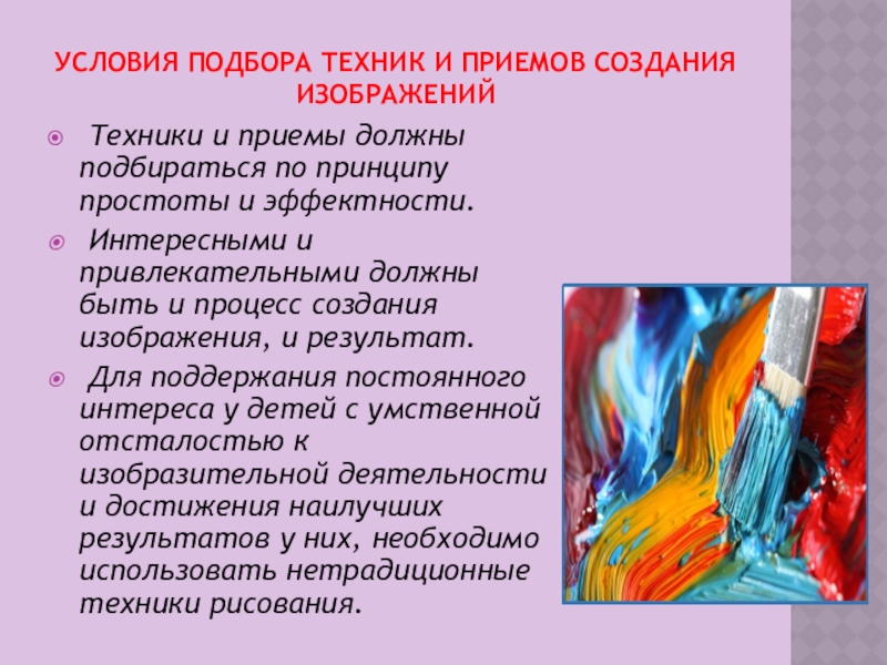 Слайд 7Условия подбора техник и приемов создания изображений