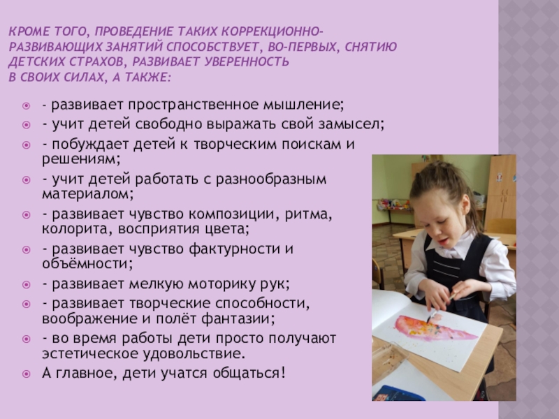Кроме того, проведение таких коррекционно-развивающих занятий способствует, во-первых, снятию детских страхов,