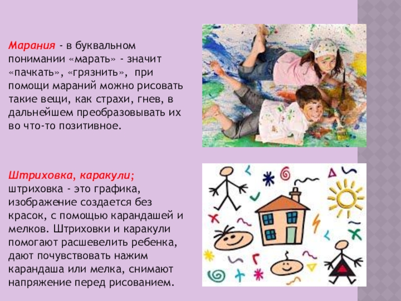 при помощи мараний можно рисовать такие вещи, как страхи, гнев, в дальнейшем преобразовывать их во что-то позитивное.