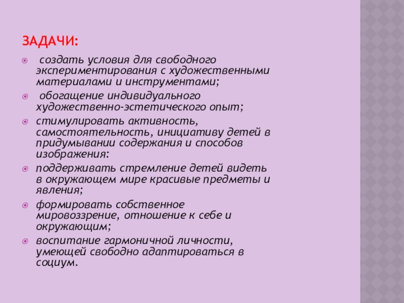 создать условия для свободного экспериментирования с художественными материалами и инструментами;