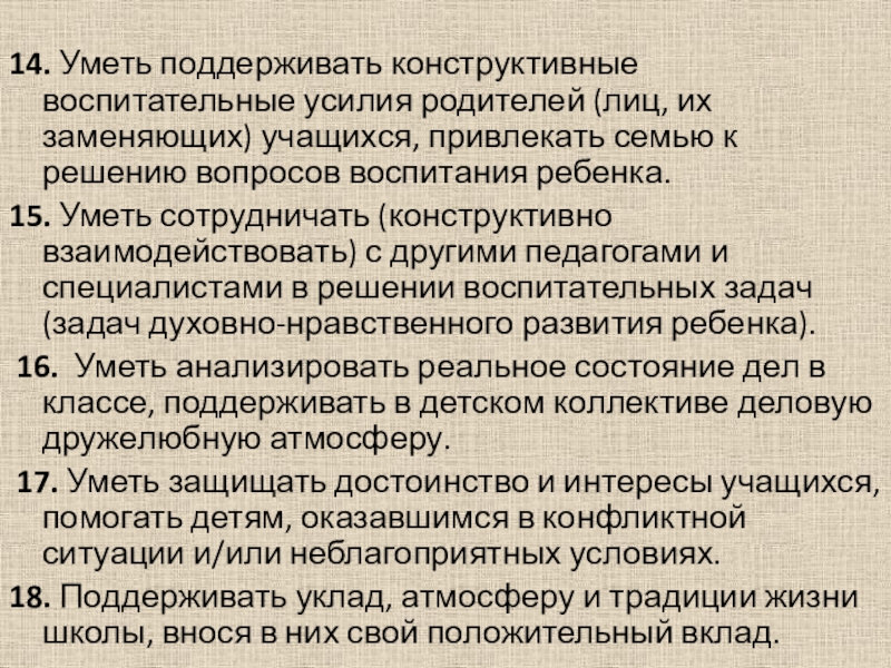 Слайд 1314. Уметь поддерживать конструктивные воспитательные усилия родителей (лиц, их заменяющих) учащихся,