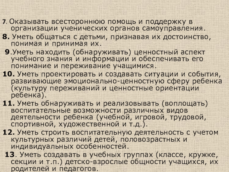 16. Уметь анализировать реальное состояние дел в классе, поддерживать в детском коллективе деловую дружелюбную атмосферу.