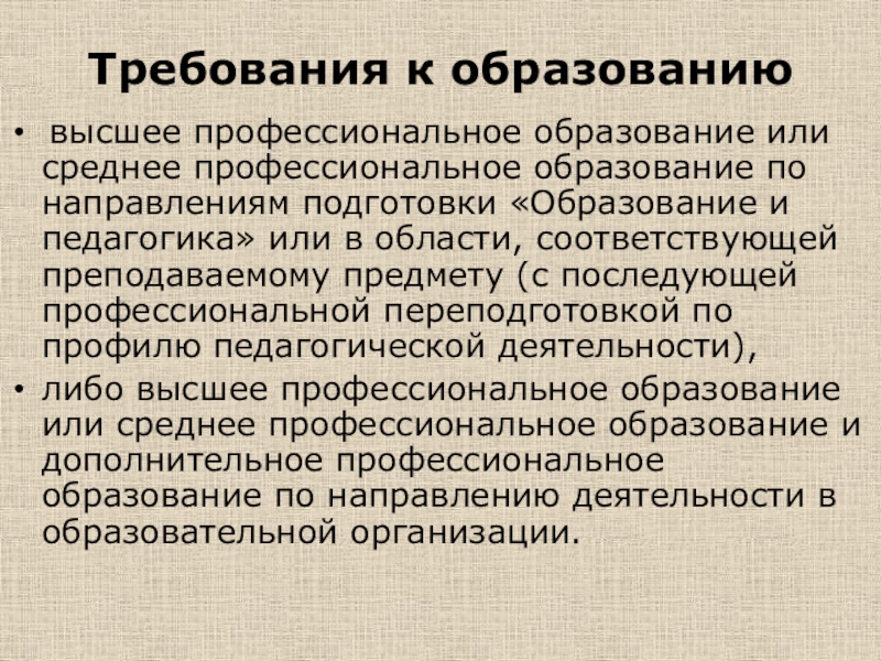 подготовки «Образование и педагогика» или в области, соответствующей преподаваемому предмету (с последующей профессиональной переподготовкой по профилю педагогической деятельности),
