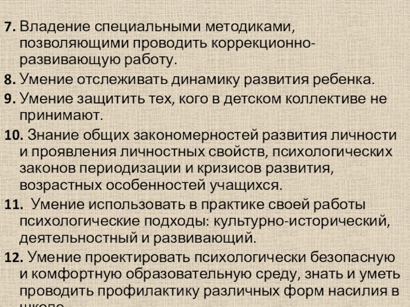 11. Умение использовать в практике своей работы психологические подходы: культурно-исторический, деятельностный и развивающий.