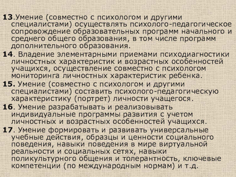 Слайд 1613.Умение (совместно с психологом и другими специалистами) осуществлять психолого-педагогическое сопровождение образовательных