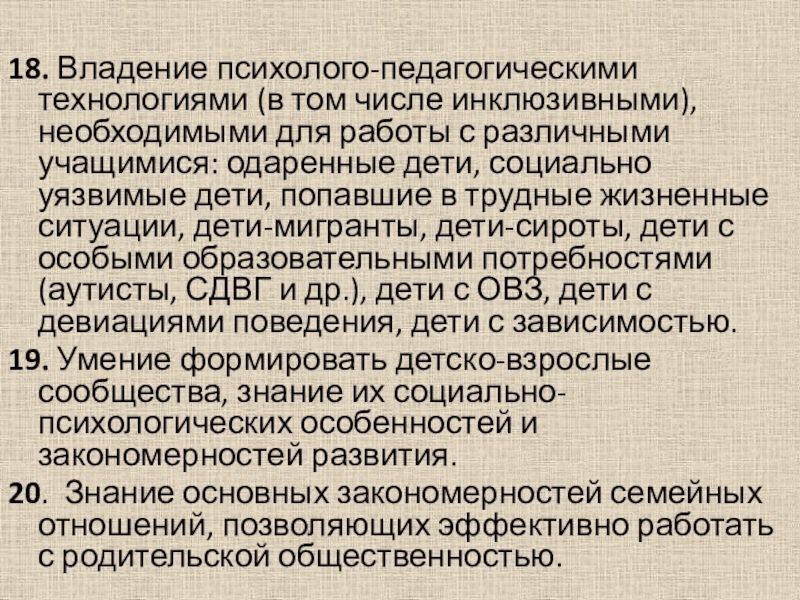 Слайд 1718. Владение психолого-педагогическими технологиями (в том числе инклюзивными), необходимыми для работы