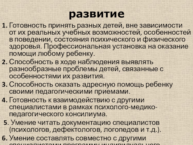 возможностей, особенностей в поведении, состояния психического и физического здоровья. Профессиональная установка на оказание помощи любому ребенку.