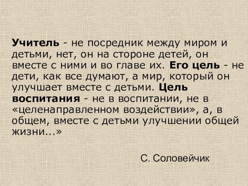 детьми, нет, он на стороне детей, он вместе с ними и во главе их. Его цель - не дети, как все думают, а мир, который он улучшает вместе с детьми. Цель воспитания - не в воспитании, не в «целенаправленном воздействии», а, в общем, вместе с детьми улучшении общей жизни...»
