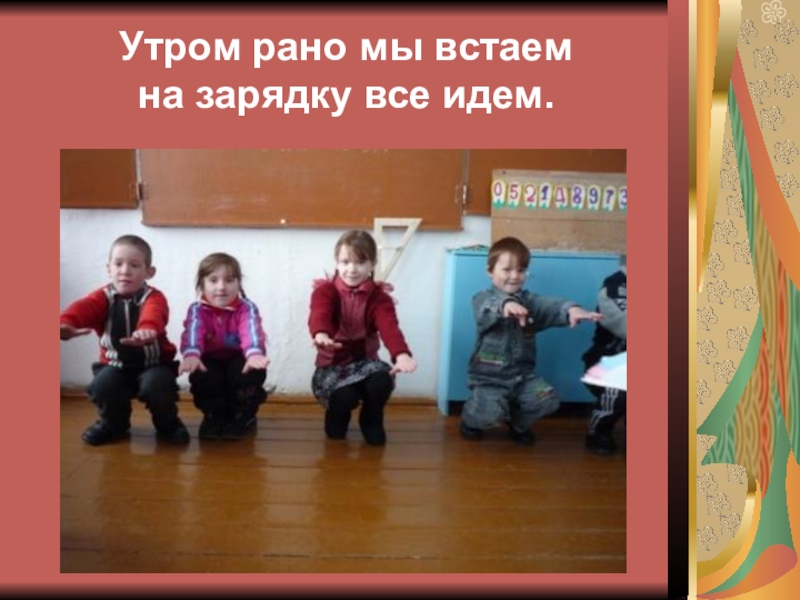 Слайд 5Утром рано мы встаем на зарядку все идем.